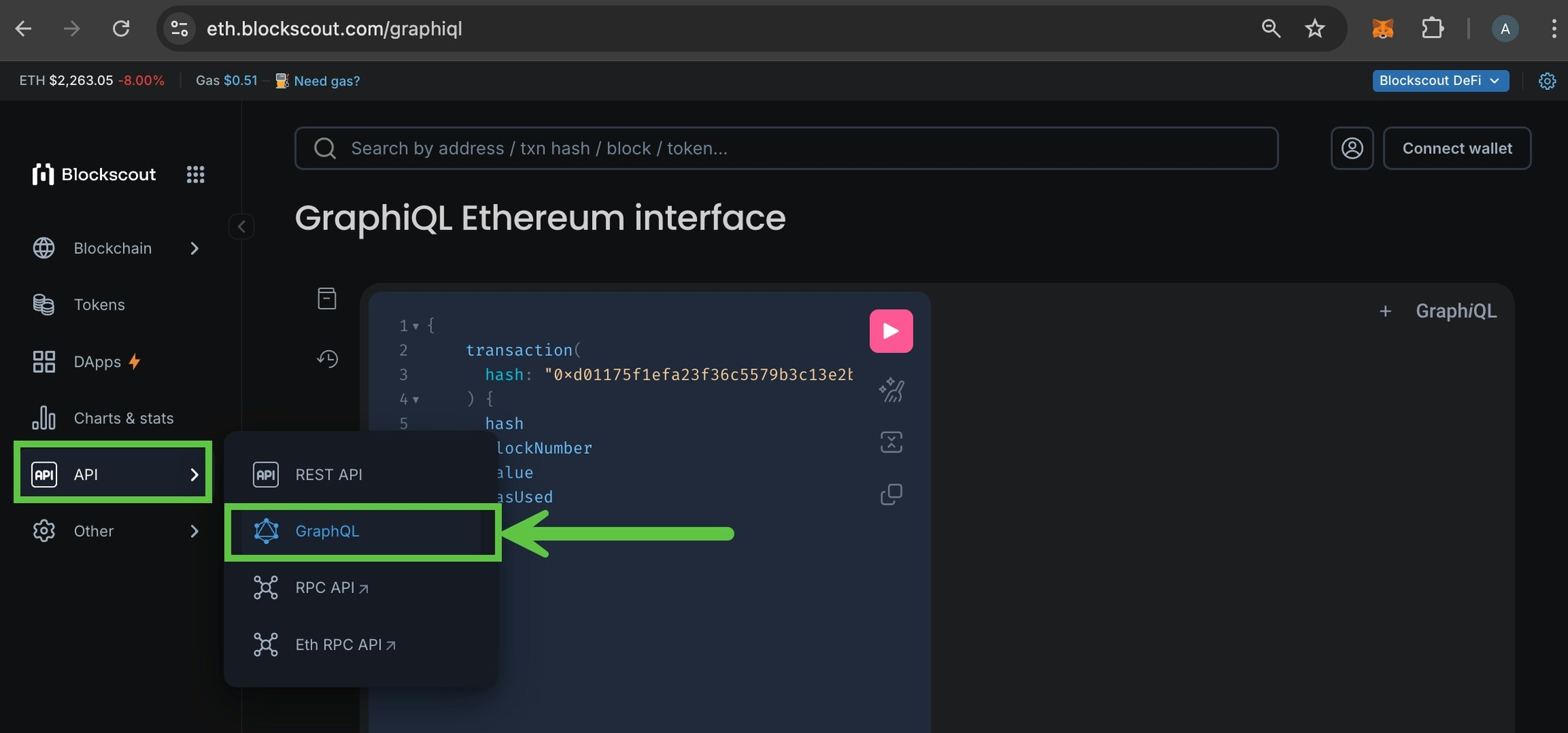 To access Blockscout GraphQL interface you can use GraphiQL - in-browser IDE for exploring GraphQL. It’s built in to Blockscout. From theAPIs dropdown menu choose GraphQL.