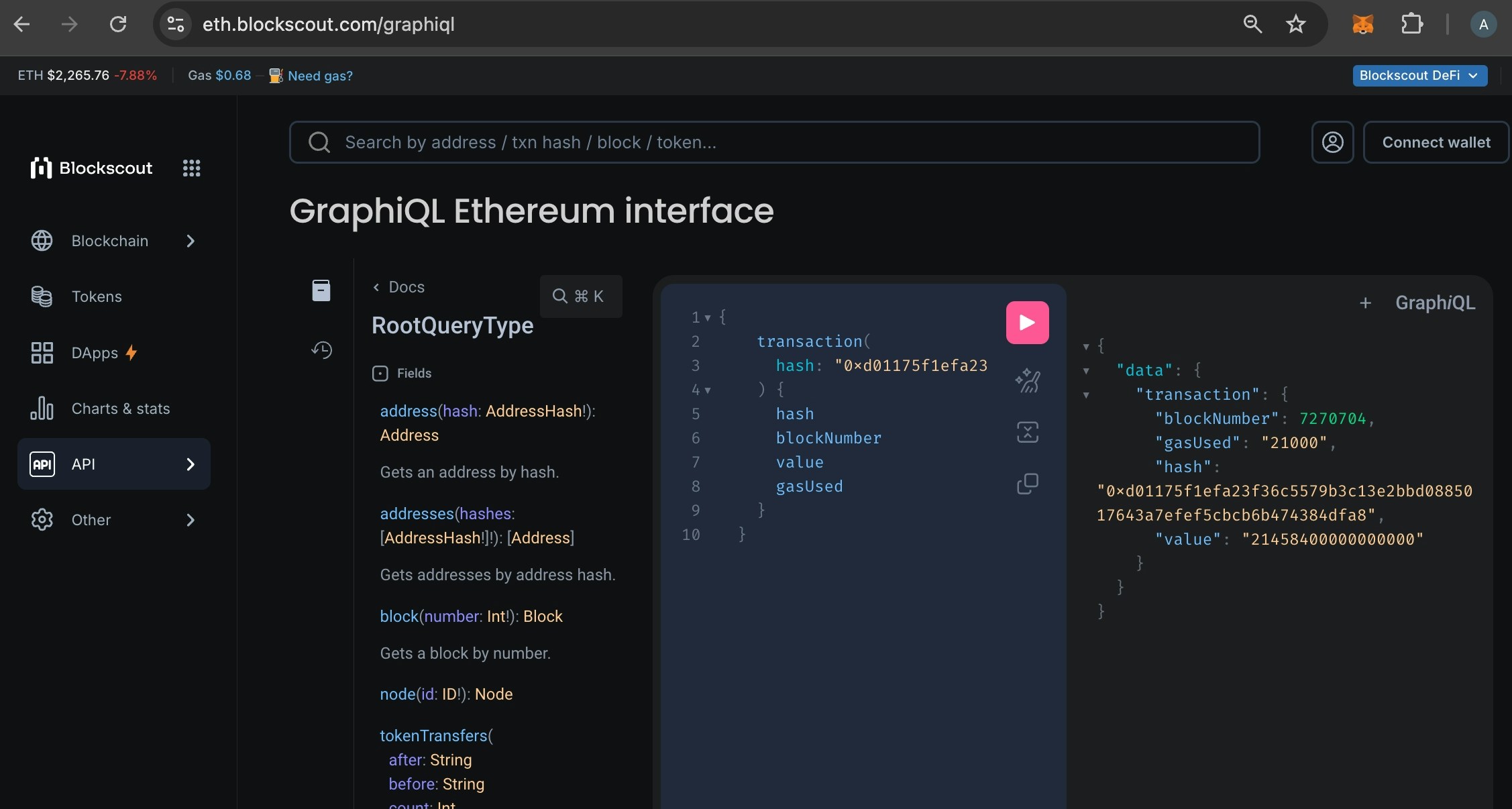 Blockscout’s GraphQL API provides queries and a subscription. You can view them in the GraphQL interface in theDocs menu. Example Queries: