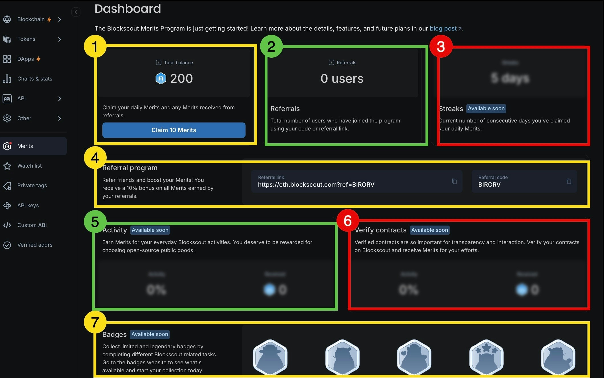 - Referral code and link: Your referral link and code. Share this code with friends and they will receive additional Merits on signup. You will receive a 10% bonus for rewards earned by your referrals for Blockscout activity. More about referrals is in the FAQ.