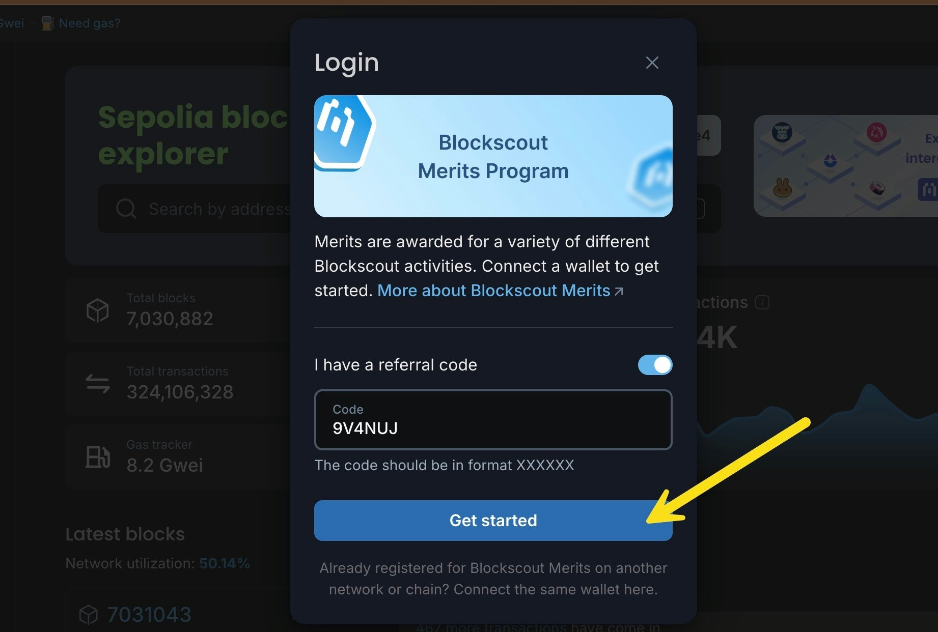 We recommend using a referral code to signup as you will receive an additional 100 Merits for a total of 200 Merits. Ask a friend or Blockscout community member (telegram, discord) if you need a code or link.1) Enter the link you received